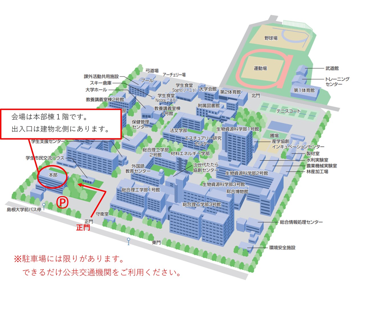 駐車場には限りがありますので,できるだけ公共交通機関をご利用ください。