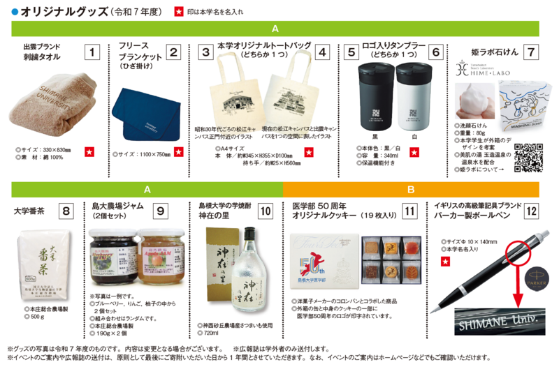 島大会員には、年間(1月~12月)寄附累計額により、島大オリジナルグッズ等を贈呈します。 毎年2月頃,前年の寄附累計額に応じ希望商品の照会をさせていただき,3月下旬頃発送いたします。